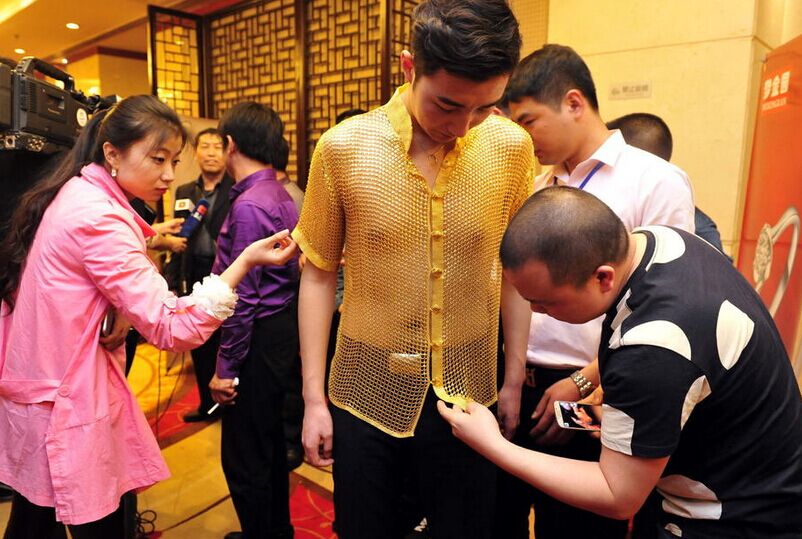 4月2日,在西安一酒店举行的活动上,身穿3公斤男式黄金衬衣的男模特和两位各身穿1.5公斤女式黄金内衣的模特,吸引了全场参会者的目光。